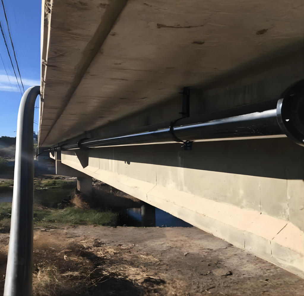 Fabricación y montaje de 60 ml de líneas de piping bajo la losa del Puente Topater en Calama, reemplazando la tubería de alimentación de agua potable hacia la ciudad.